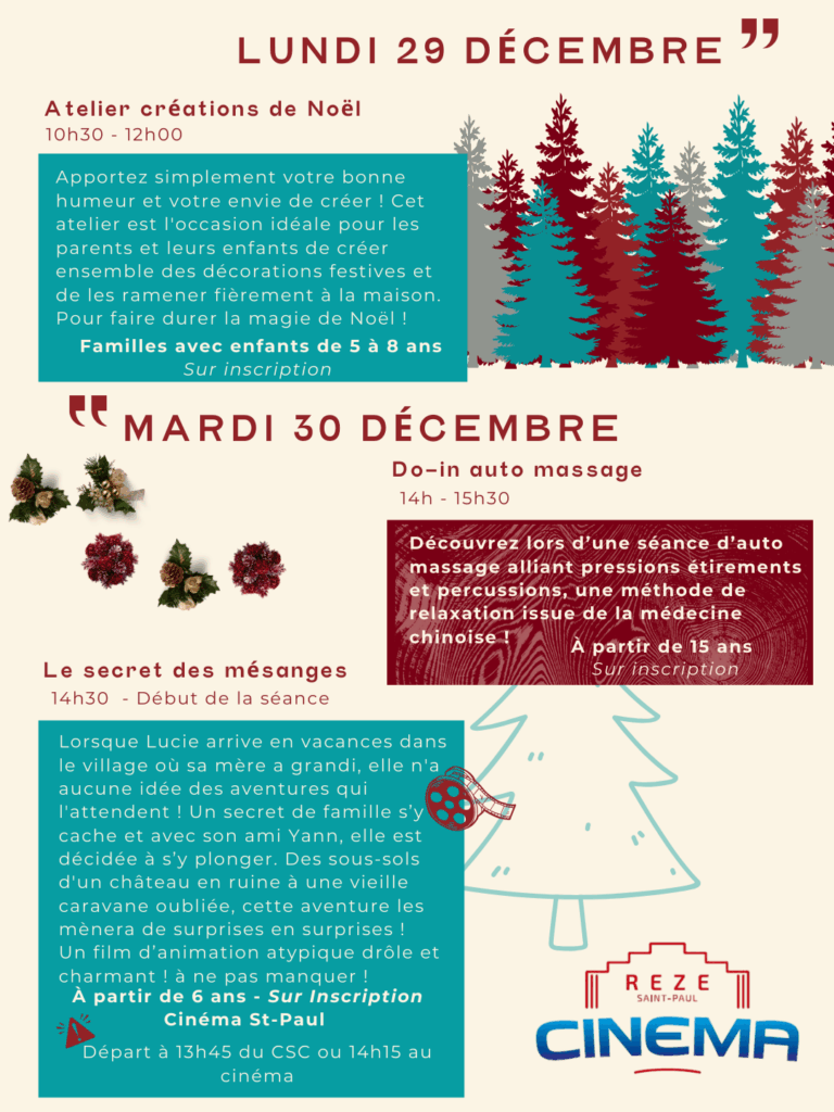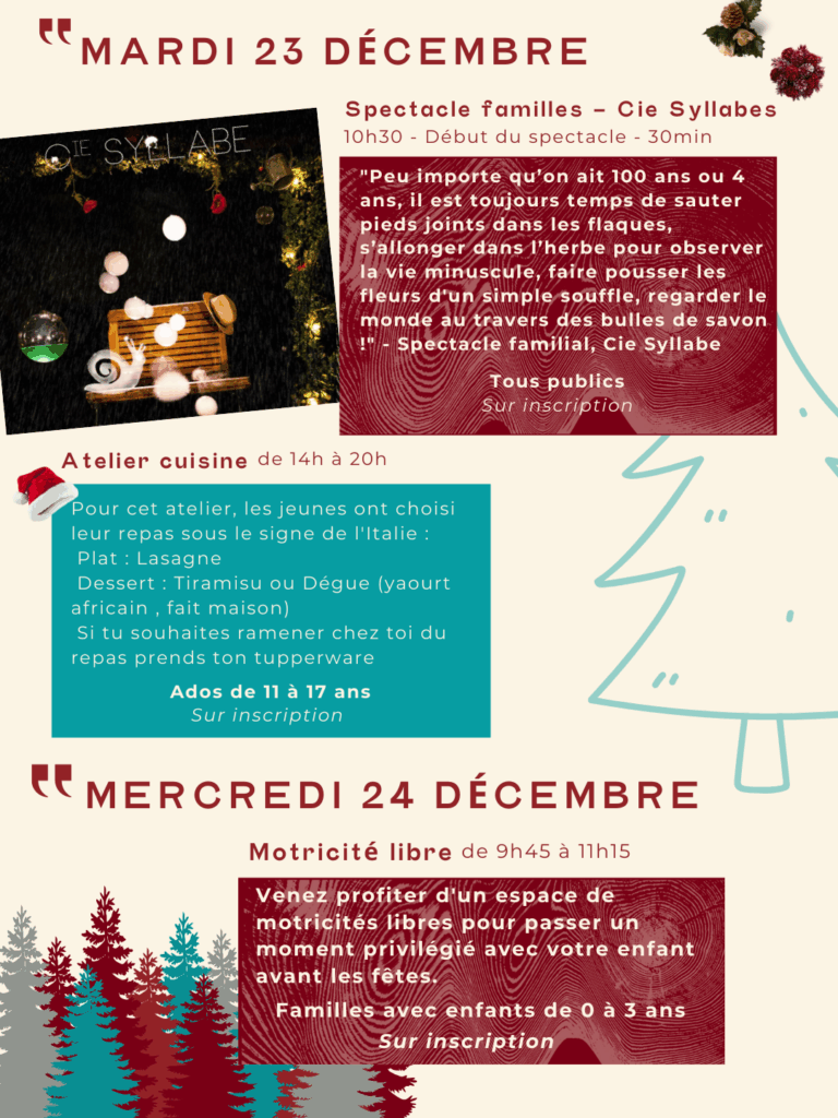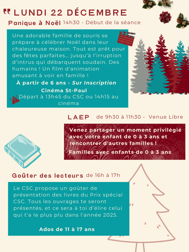 PENDANT LES VACANCES, LE CSC SERA OUVERT DU 22/12 au 24/12 midi et du 29/12 au 31/12 midi.